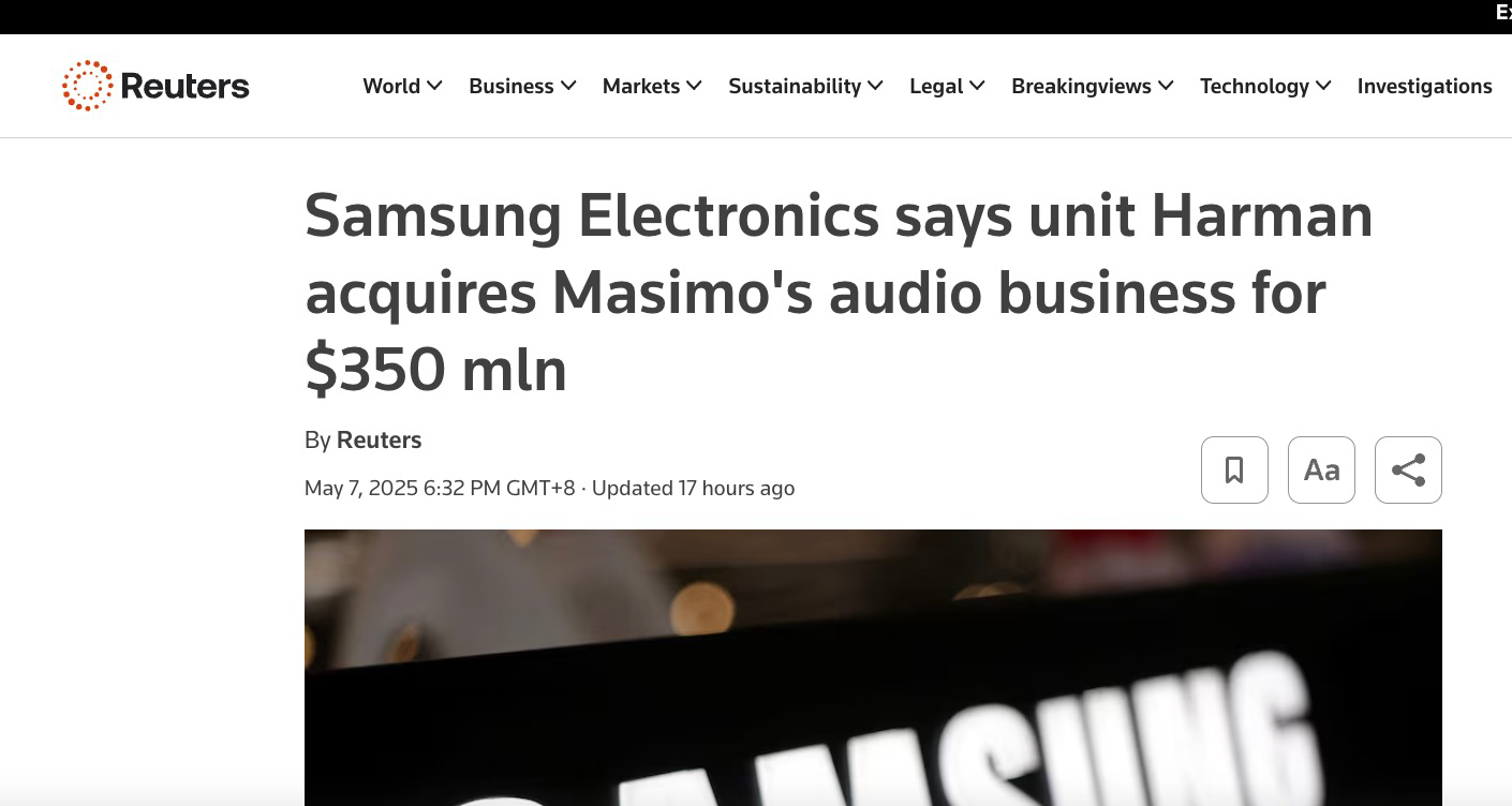 外媒:三星子公司将以3.5 亿美元收购Masimo音频业务